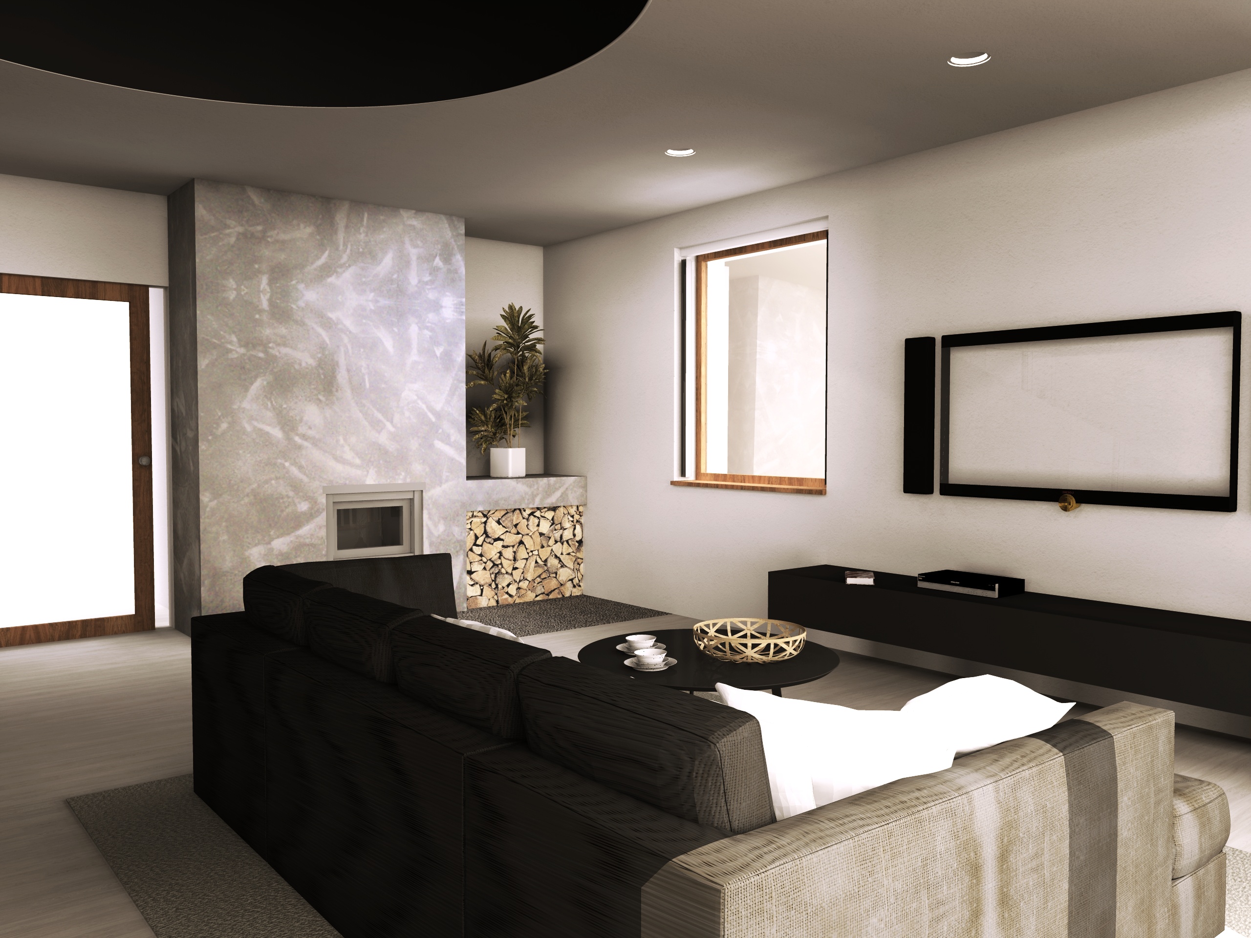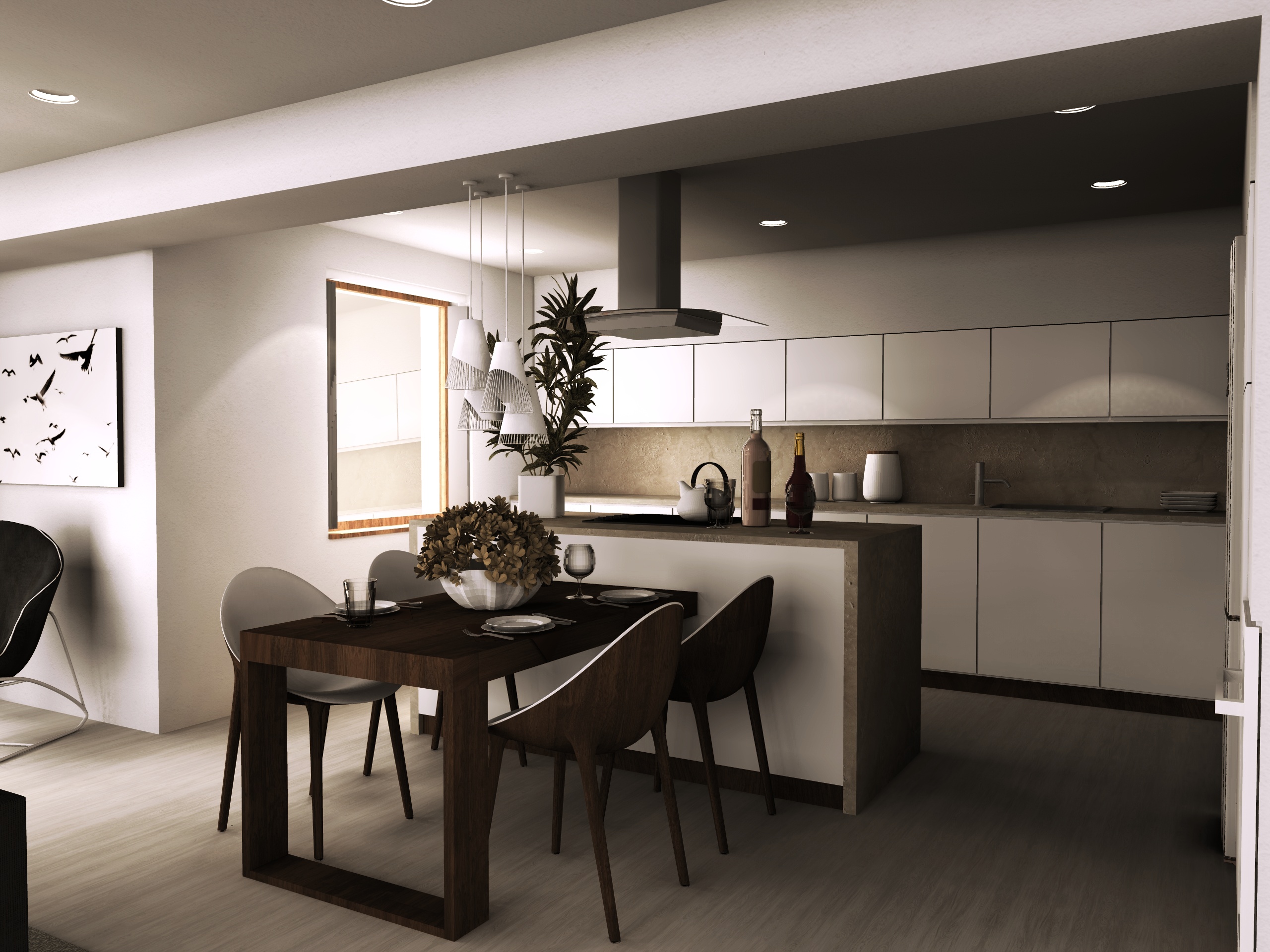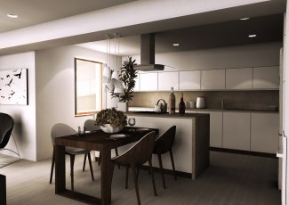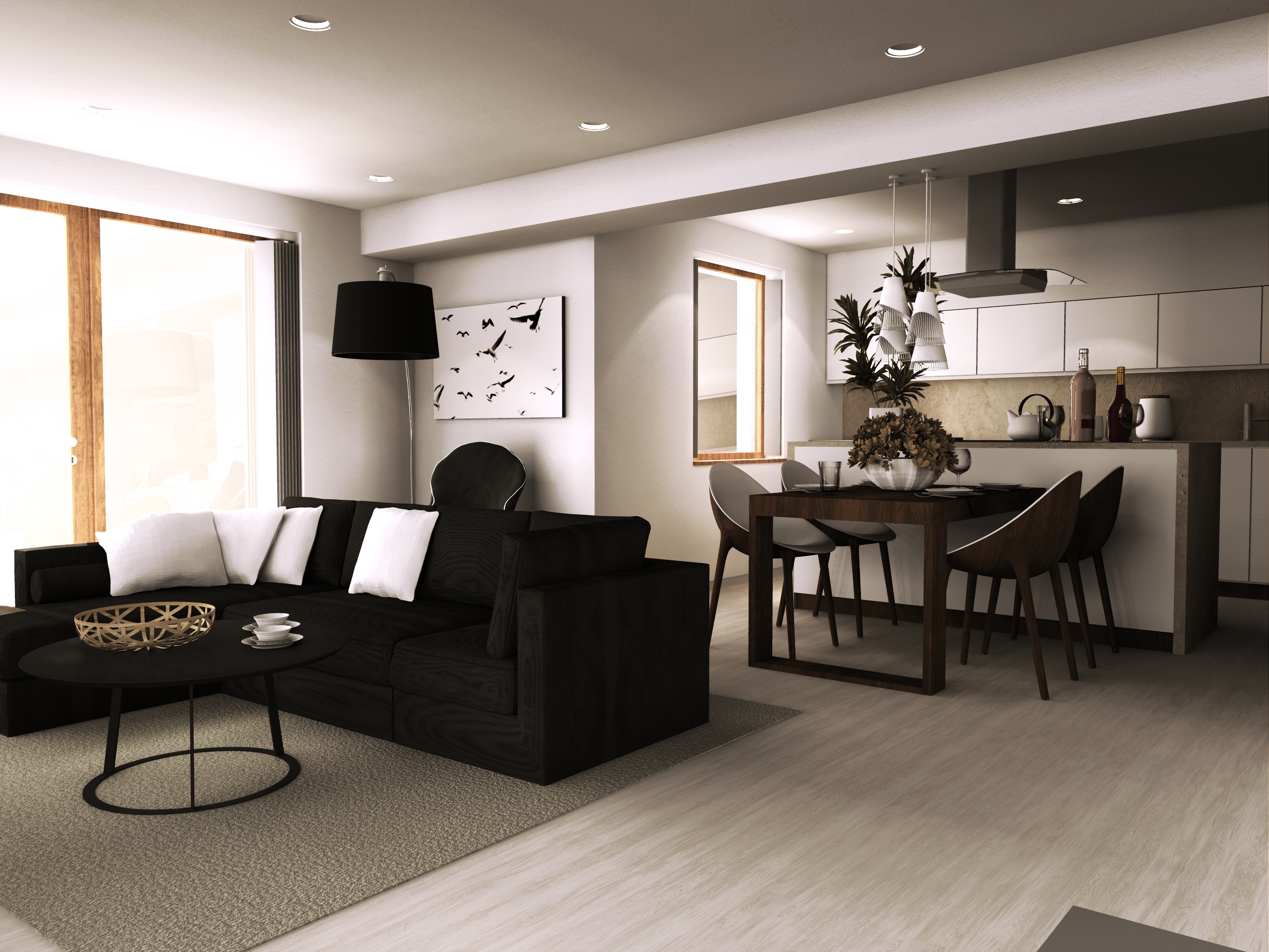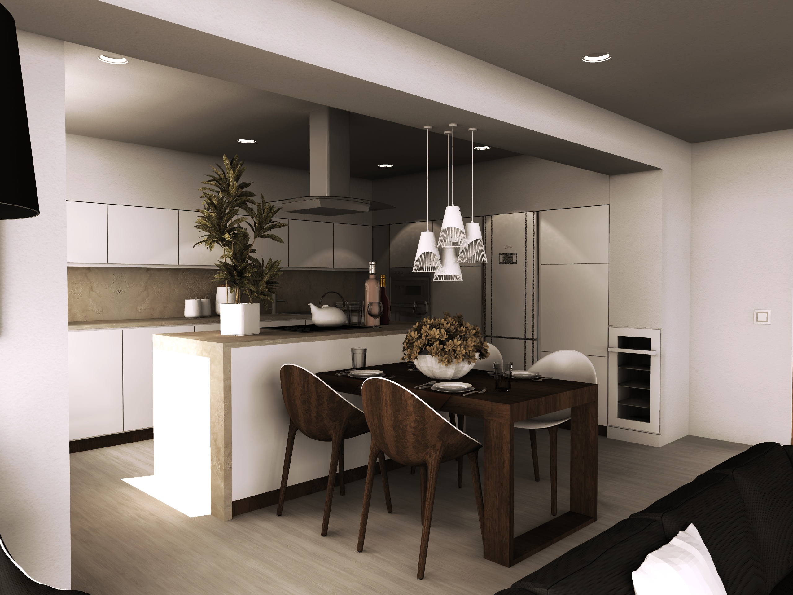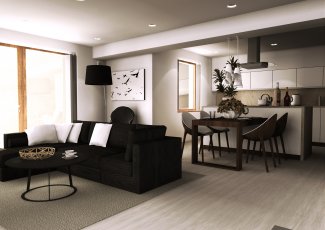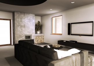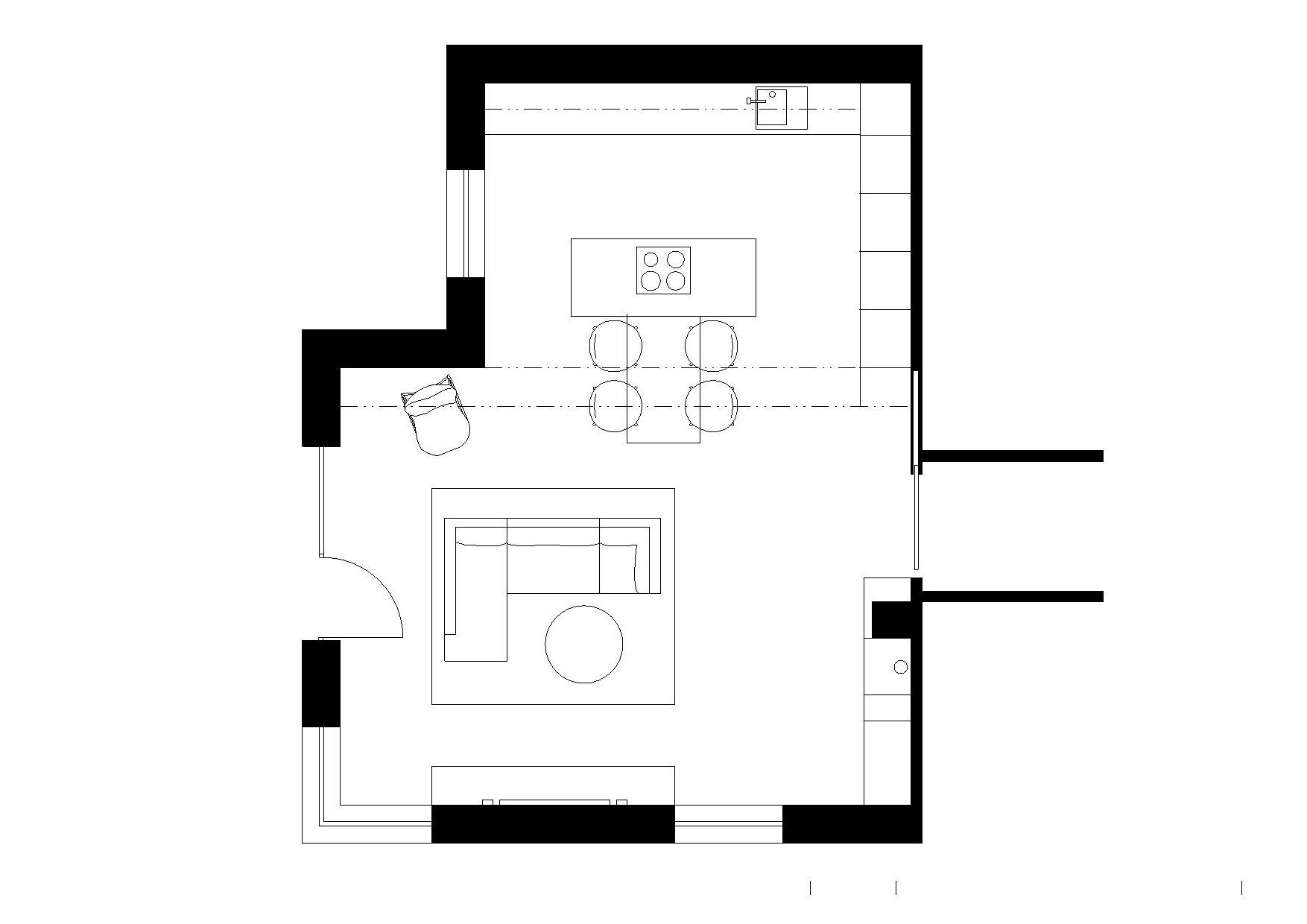 Interiér hlavního obytného prostoru RD v Benátkách nad Jizerou. V návrhu vzniklo několik variant uspořádání mobiliáře v prostoru, o což šlo především. Hlavním rébusem se ukázala být návaznost kuchyňské linky a jídelního stolu. Obývací část poměrně jasně vyplývá z daných možností a v průběhu vývoje zůstal prakticky beze změn.